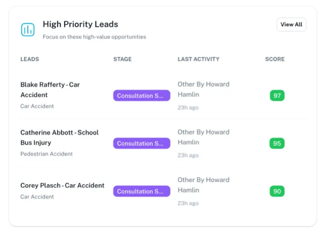 AI scoring separates serious inquiries from noise. Leads are organized by urgency and relevance, with clear next steps for follow-up. Your team spends time on the cases you actually want.