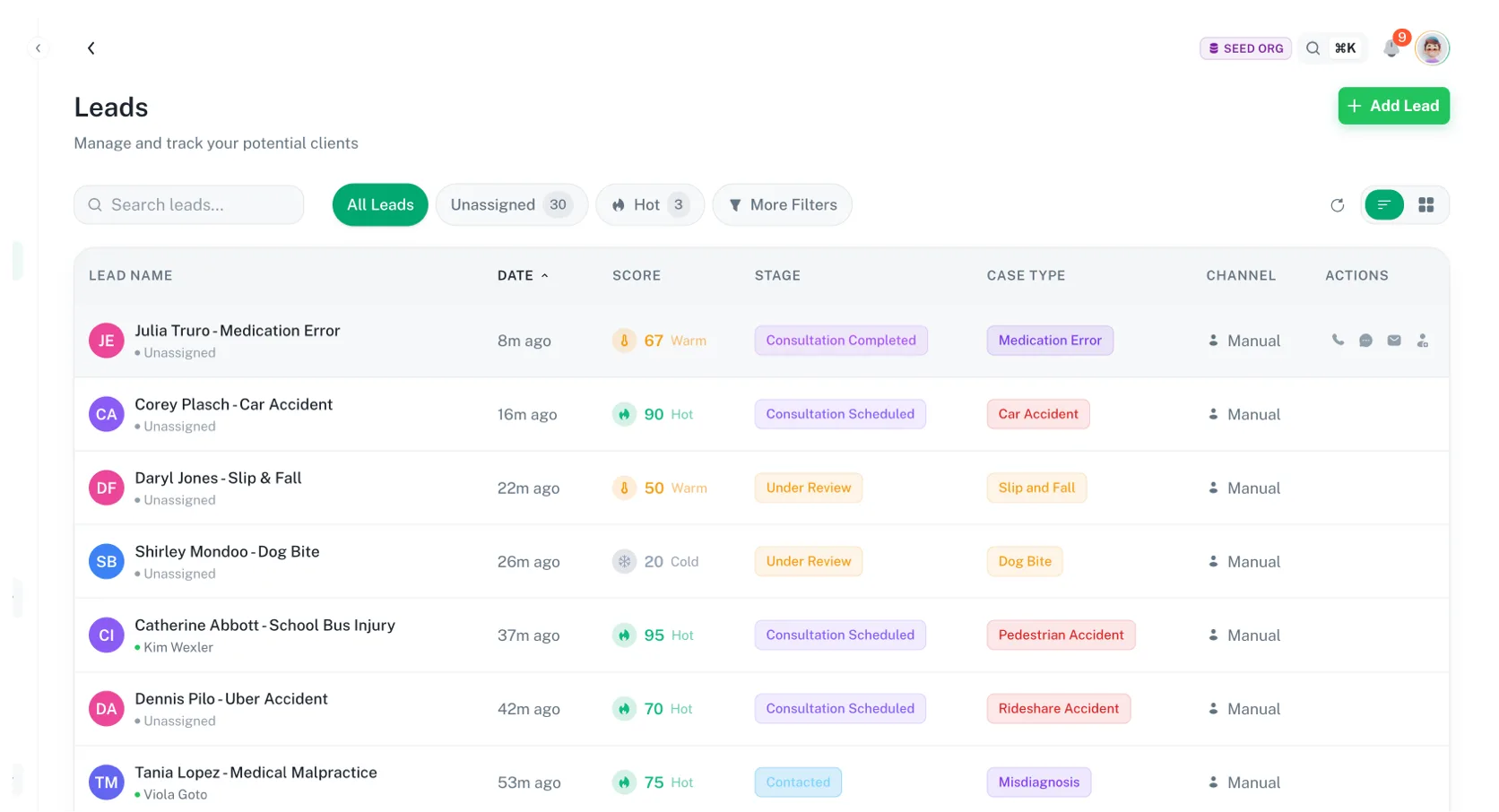 AI scoring separates serious inquiries from noise. Leads are organized by urgency and relevance, with clear next steps for follow-up. Your team spends time on the cases you actually want.
